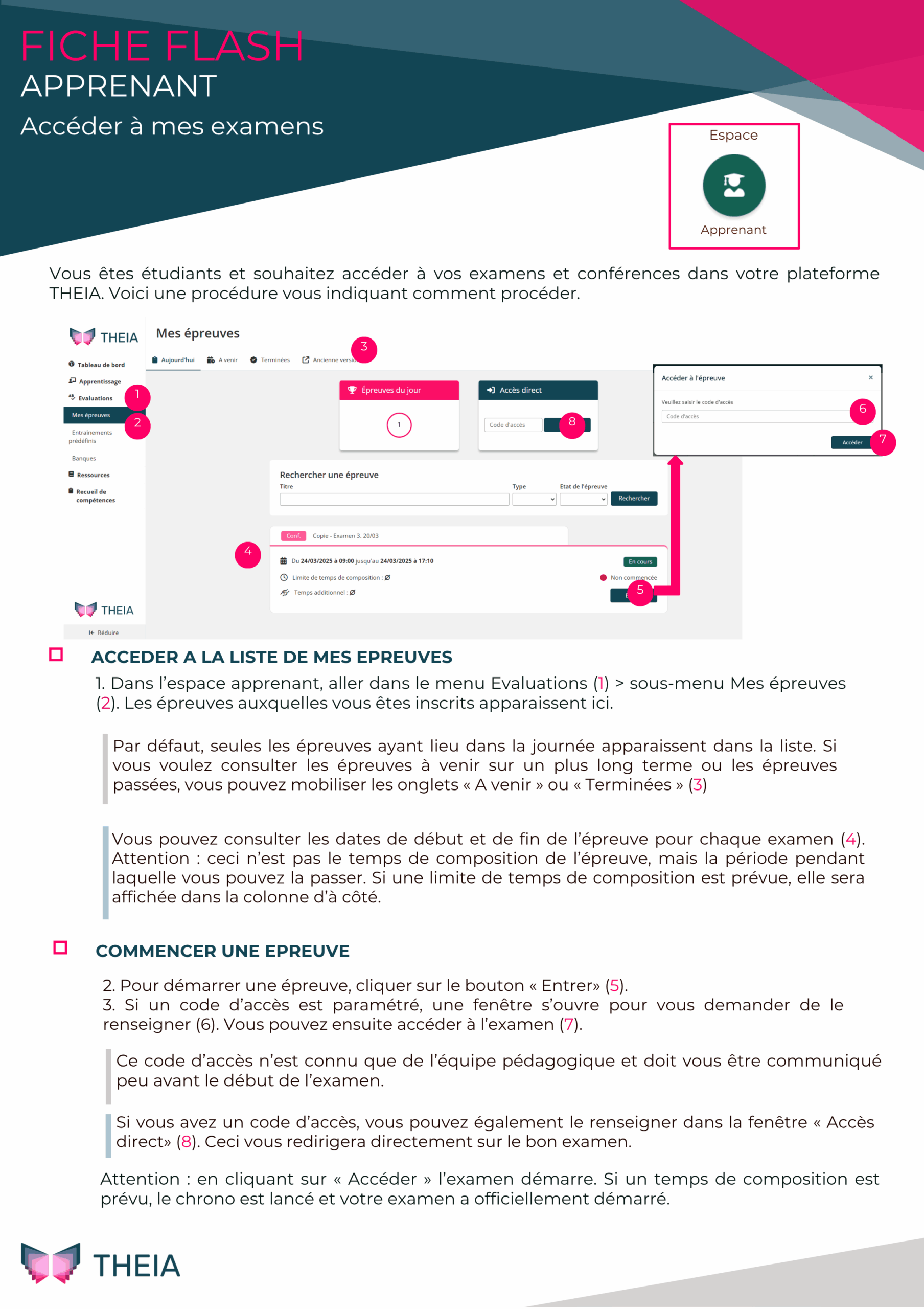 Voici une procédure en une page pour savoir comment accèder à vos épreuves (conférences et/ou examens) en tant qu’apprenant. Cette fiche flash est la première partie de de la section « Espace apprenant ».