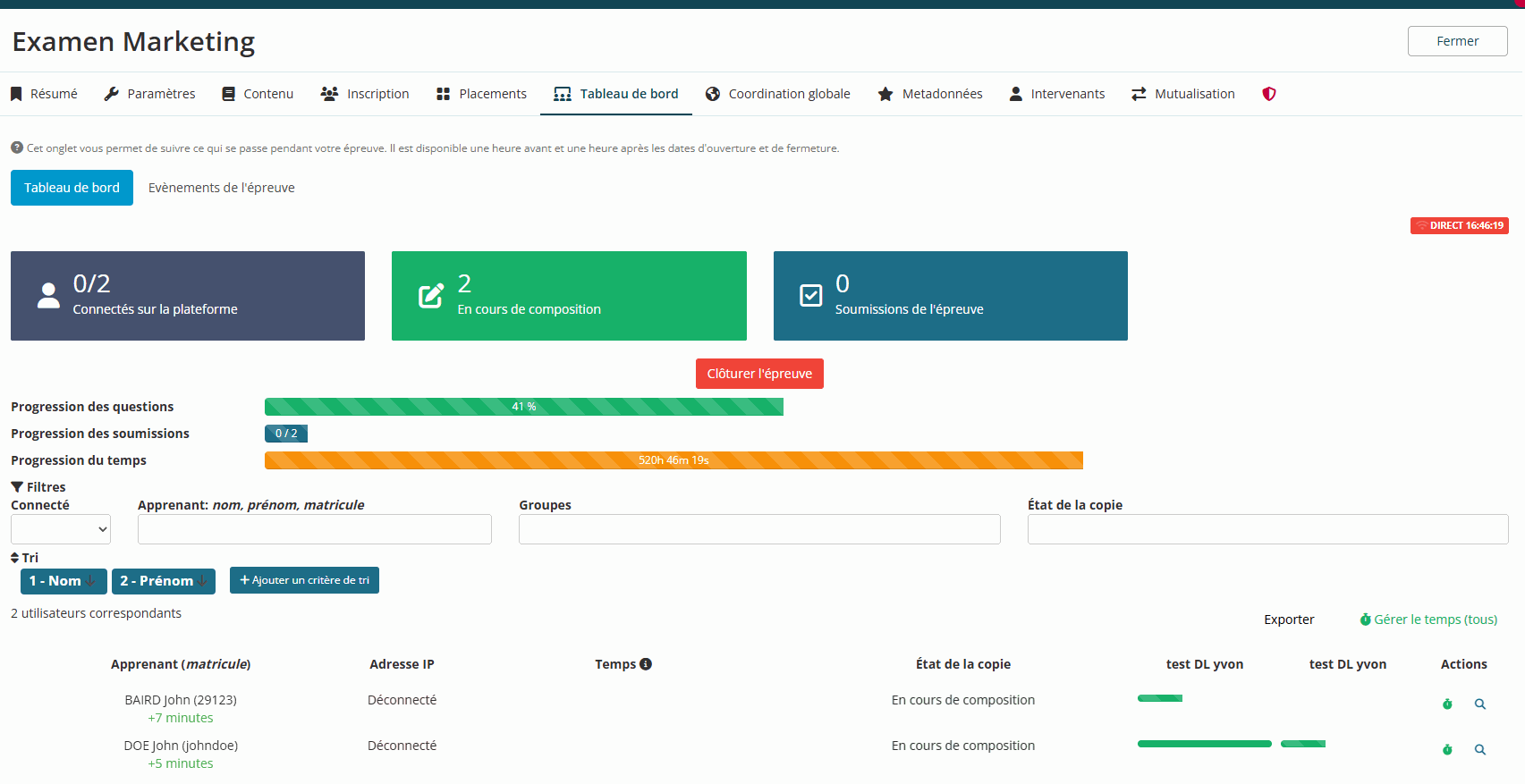 Dans ce mode, les actions critiques, telles que les actions de masse, la clôture de l’épreuve ou encore l’export du tableau de bord, sont désactivées, garantissant un accès sécurisé et adapté à leurs besoins de suivi.