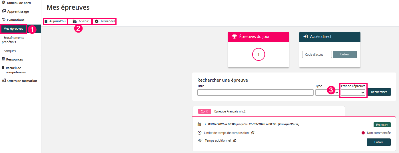 Pour accéder à vos épreuves passées, vous pouvez vous rendre dans le menu Evaluation > Mes épreuves de votre espace apprenant (1). Sur cette page vous visualisez par défaut les épreuves qui ont lieu le jour même. Si vous souhaitez voir vos épreuves à venir ou terminées, vous pouvez modifier le filtre « Etat » ou choisir l’onglet d’état (2) (3). Cela vous affichera la liste de l’ensemble des épreuves que vous avez à venir ou vous avez passées sur THEIA.