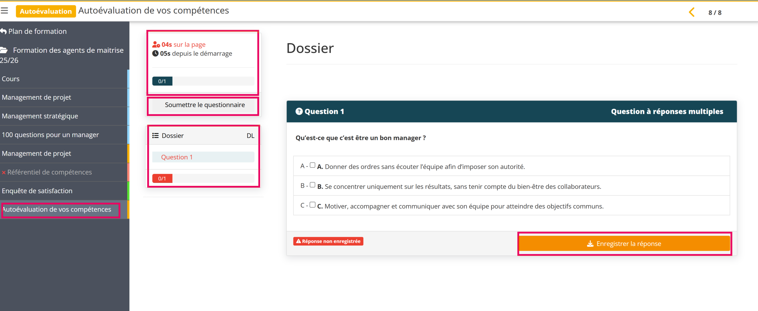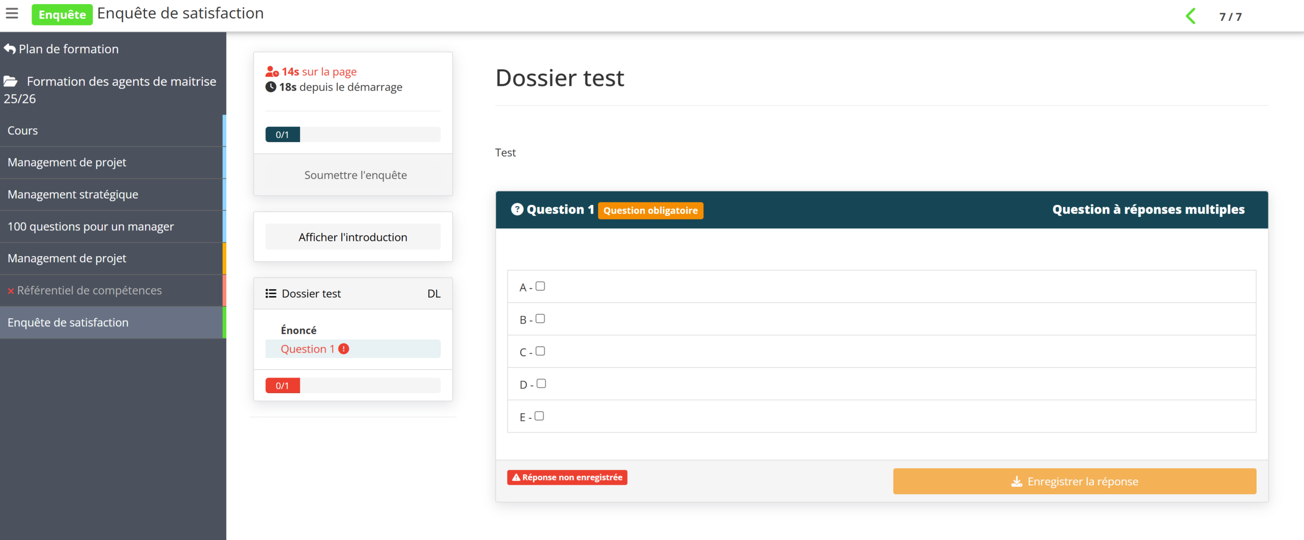 Par ailleurs, la section Dossier, située à droite de l’écran, permet de visualiser votre progression. À chaque question répondue, la case correspondante se colore en vert.