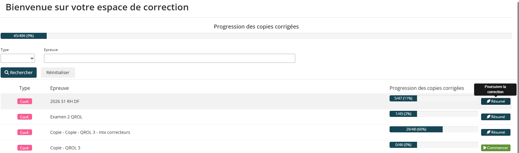 Une fois arrivé sur votre interface correcteur, vous avez la liste des épreuves dans lesquelles vous devez intervenir. Pour cela, il vous suffit de cliquer sur « Commencer » ou « Résumé » selon l’état d’avancement.