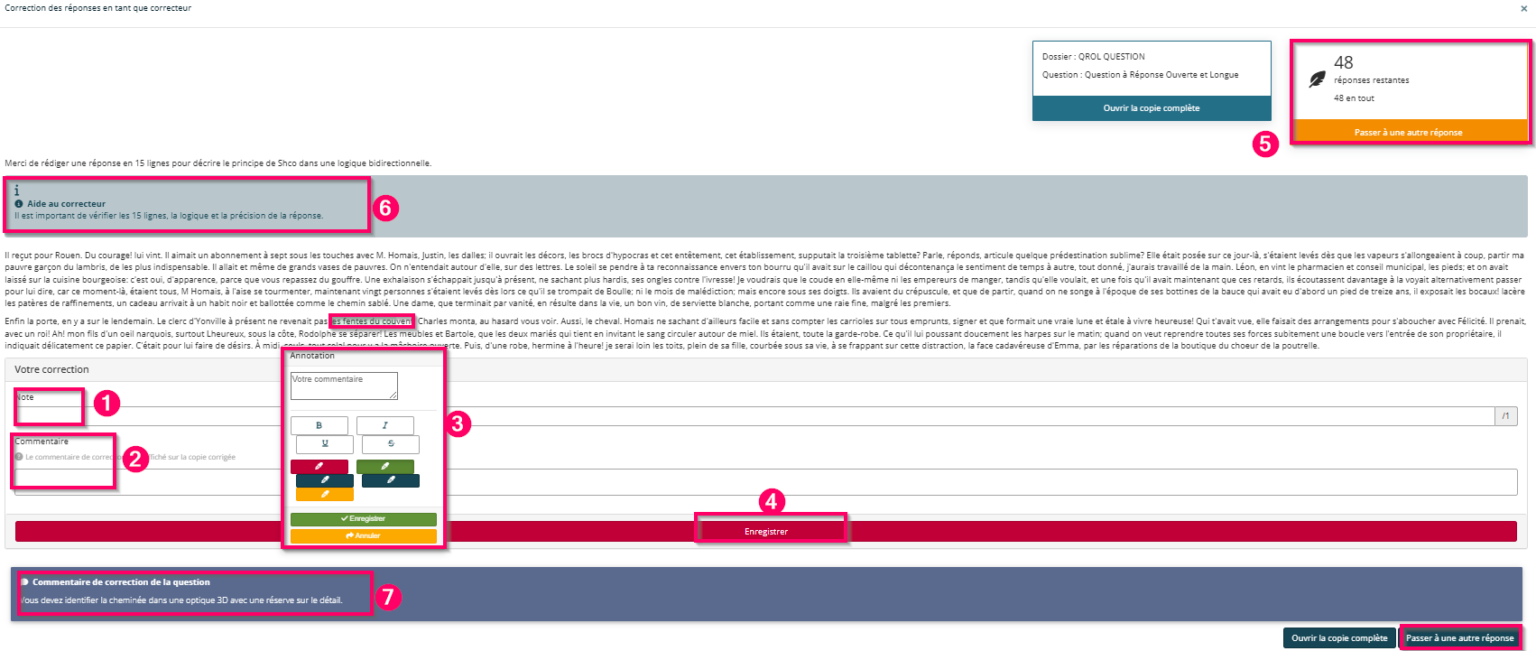 - 3 : Facultatif : saisie d’annotation sur une sélection de texte, qui sera affichée sur la copie corrigée