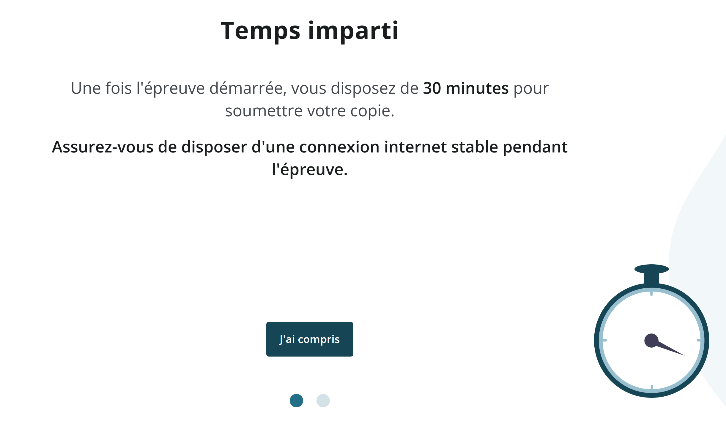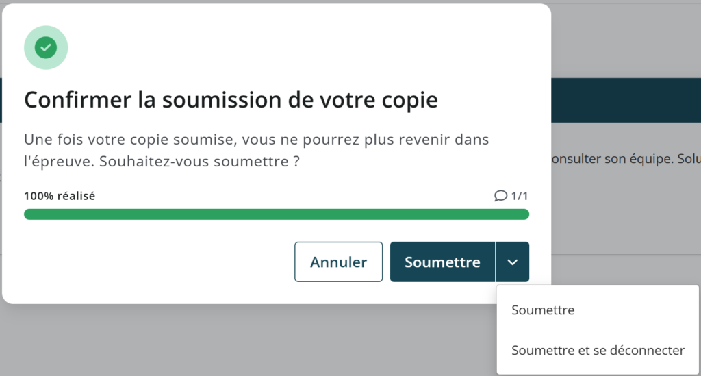Lorsque vous terminez votre épreuve, plusieurs options s’offrent à vous. À noter que si vous êtes encore en cours de composition à la fin du temps imparti, votre copie sera automatiquement soumise.