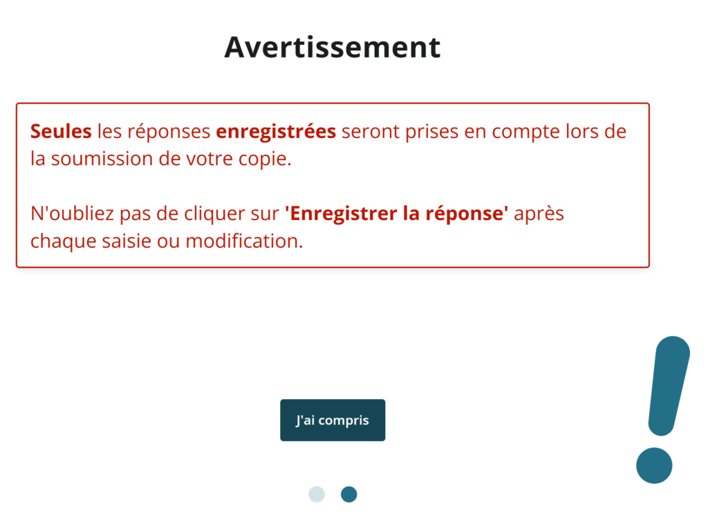 Enregistrement des réponses : Il est primordial d'enregistrer chaque réponse. Dans le cas contraire, les propositions ne seront pas conservées et la copie sera vide.
