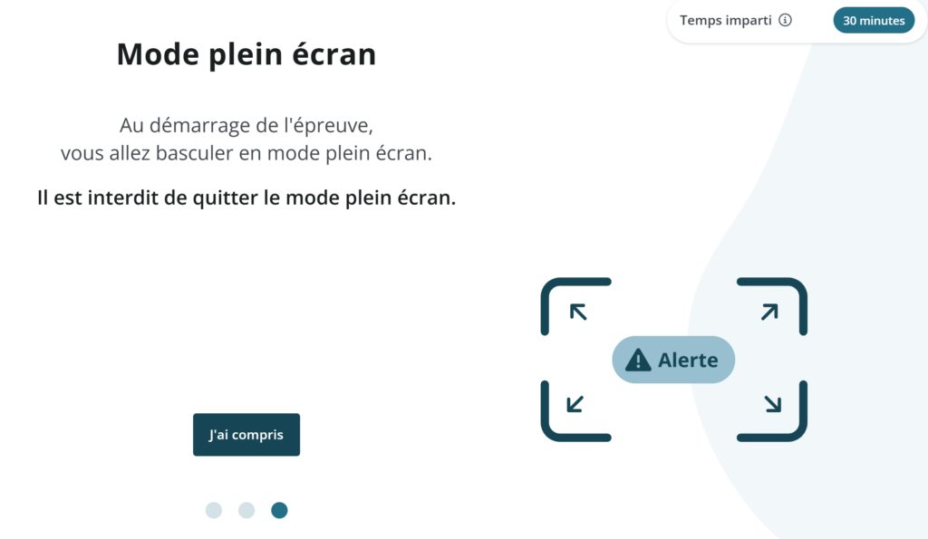 Mode plein écran : Il s'agit d'une aide à la surveillance. Lorsqu'un.e participant.e quitte cet aménagement durant l'épreuve, pour changer de fenêtre ou ouvrir un nouvel onglet du navigateur, le/la surveillant.e sera automatiquement informé.e.