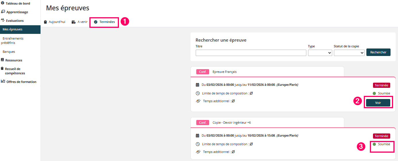 Quant aux épreuves terminées (1), l’apprenant peut visualiser la copie soumise en cliquant sur le bouton « Voir » (2). Si la copie n’est pas disponible, ce bouton ne s’affiche pas (3).