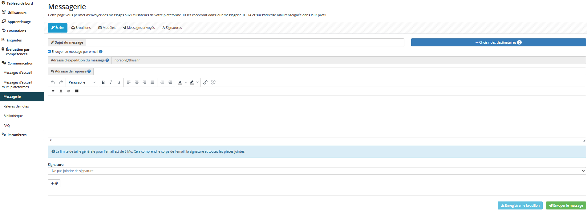 En se rendant dans le menu « Communication > Messagerie », la plateforme offre la possibilité d’envoyer aux utilisateurs des messages internes ou mails.
