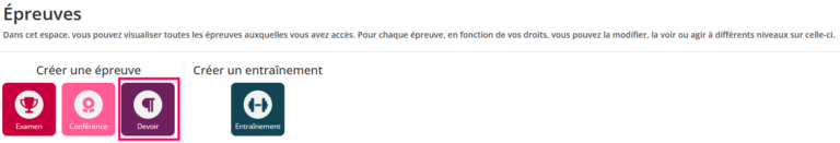 Au niveau du menu « Evaluations > Epreuves », vous avez la possibilité de créer un nouveau type d’épreuve « Devoir » permettant aux apprenants de déposer un fichier directement sur THEIA.
