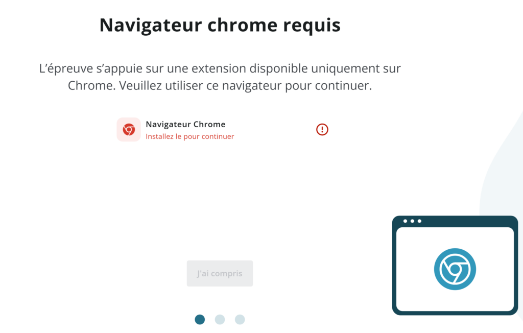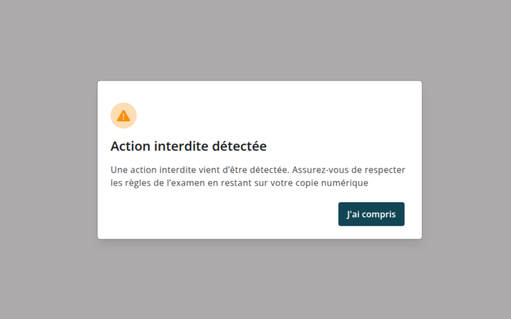 → Si des actions interdites sont faites pendant l’épreuve, vous aurez une fenêtre avec un message d’avertissement (= tout comme les surveillants de votre épreuve)