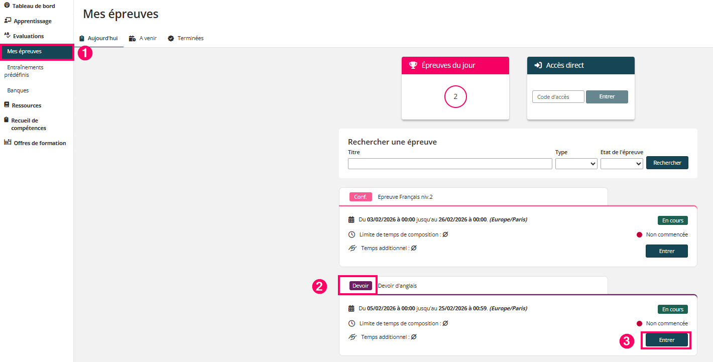Pour accéder au devoir, l’apprenant peut cliquer sur le bouton « Entrer » (3) si l’épreuve est disponible.